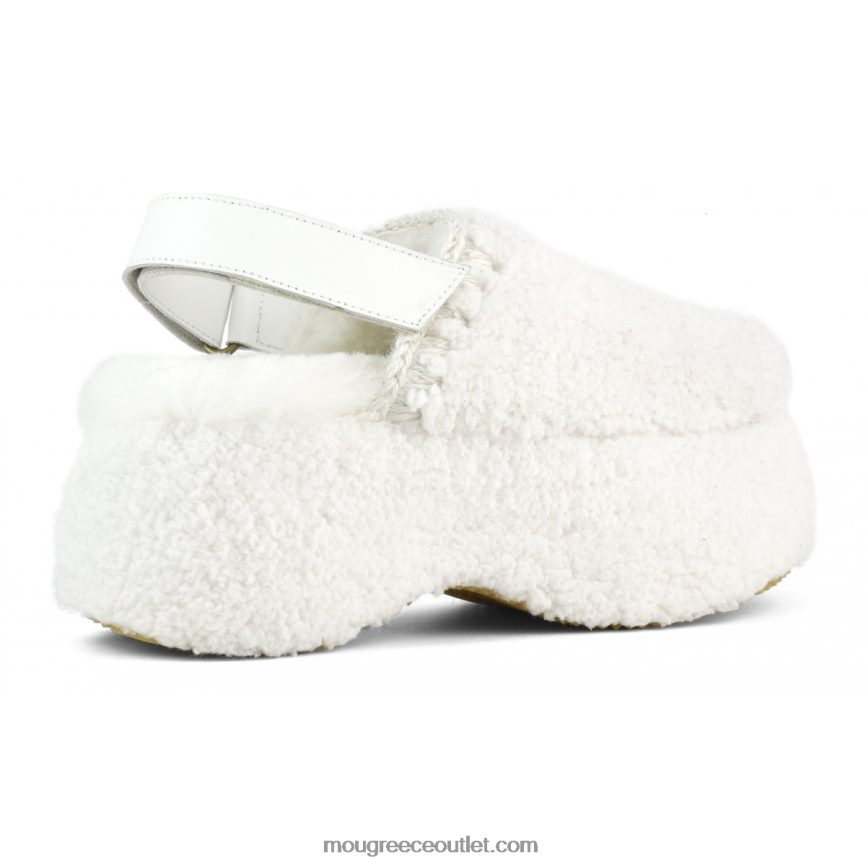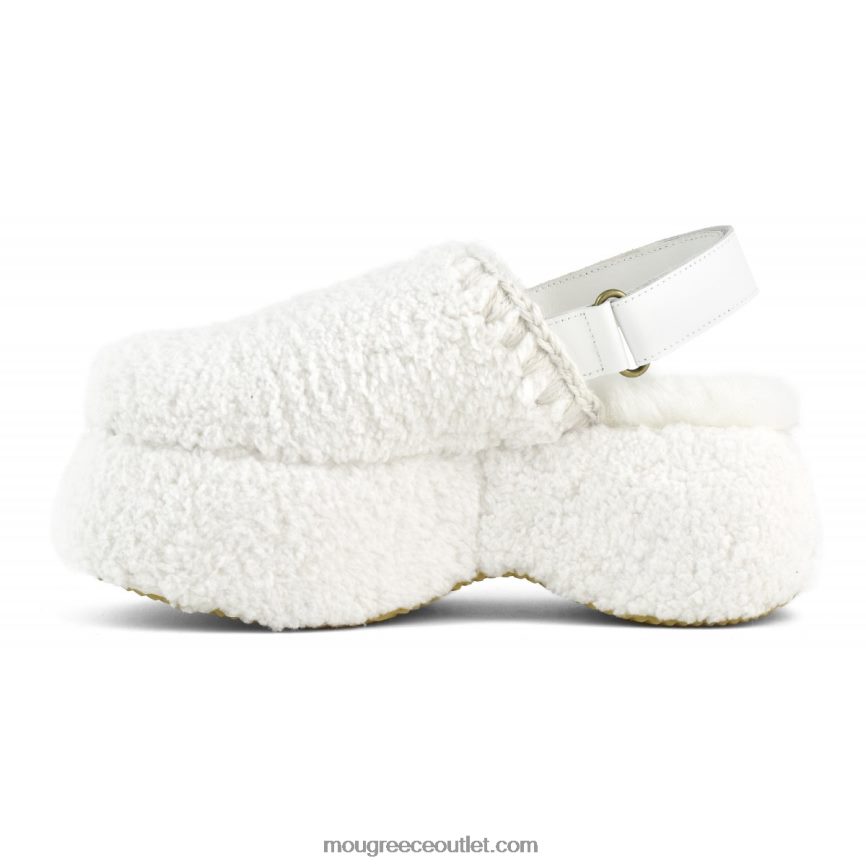 ένα χαριτωμένο πέδιλο πλατφόρμας από ψεύτικη γούνα sherpa, χειροποίητο με λεπτομέρειες από το σήμα κατατεθέν βελονιά βελονιάς mou, μια ελαφριά σόλα από καουτσούκ και μια γεμισμένη σόλα από μικροσουέντ για επιπλέον άνεση. ύψος 50mm.